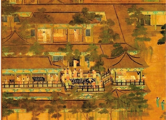 據考為五代的《唐宮乞巧圖》,可算是表現現實題材里最棒的一幅了。因為它遠看貌似是亭臺樓宇那種的“景物畫”。可是我們進一步放大細節。看到那些小碟碗了吧。這些就是給“乞巧”過節做的準備。估計沒錯的話,就是我上面說的,把針放到小碗水里的那種游戲……