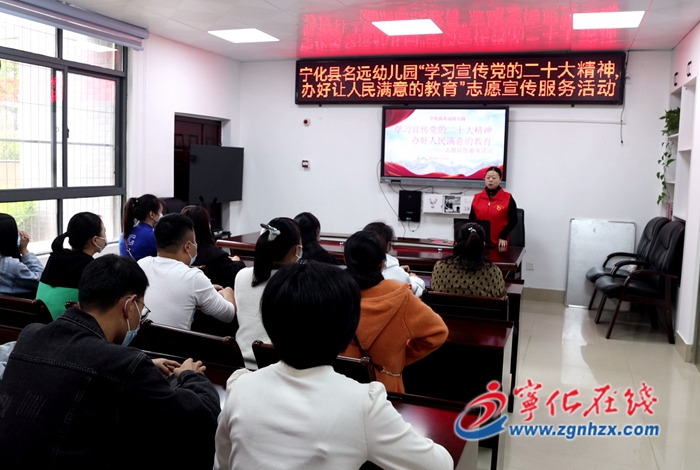 11月21日,寧化縣名遠幼兒園教師、志愿者走進濱江社區,結合自身感悟與身邊故事,向濱江社區黨員群眾宣傳黨的二十大精神。
