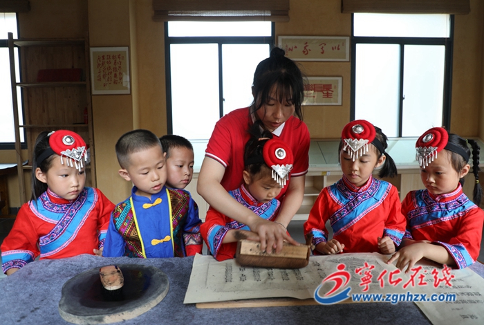 在老師和家長的帶領下,幼兒先后走進畬鄉(xiāng)文化長廊、畬鄉(xiāng)文化展館、畬鄉(xiāng)古山寨、刀耕火種園等地,現(xiàn)場了解畬鄉(xiāng)文化,體驗省級非遺木活字印刷術的刻字、排版、印刷等技藝。