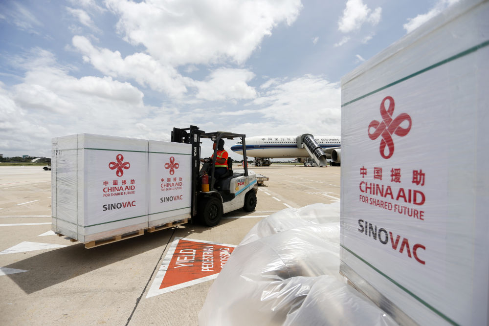 工作人員在柬埔寨金邊國際機場運輸中國政府援助柬埔寨的科興新冠疫苗(2021年10月14日攝)。新華社發(批隆攝)