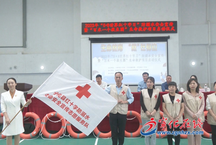 活動儀式上,孫元玲為寧化縣紅十字防溺水生命安全宣傳志愿隊授旗,周子發作動員講話。