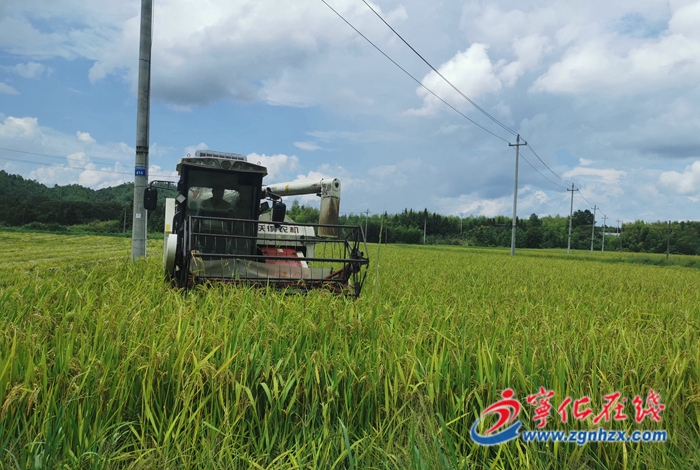 8月24日,在寧化縣湖村鎮水稻制種基地,兩臺聯合收割機開足馬力在田里來回穿梭。伴隨著隆隆機聲,割稻、脫粒、裝車一氣呵成,大約15分鐘左右,便完成一畝稻田的收割任務。