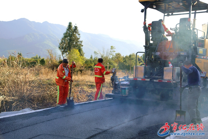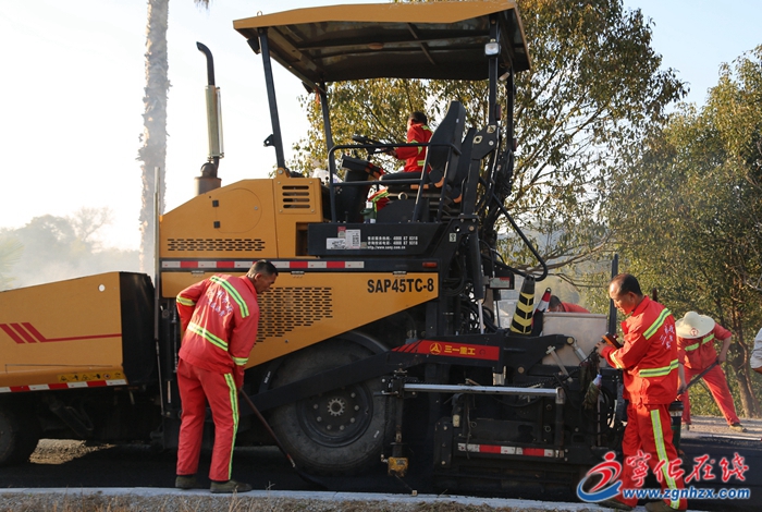 近日,在湖村蛟湖文旅小鎮彩虹步道施工現場,工人往來忙碌,壓路機正來回作業。該步道全長350米,此時,工人們正在鋪設瀝青路面的最后一層。