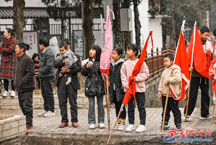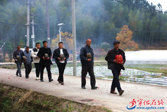 上午九時許,“儺神”面具裝扮完成,七位儺神依次手舞足蹈地從吳氏祖堂大門跳出來,各手持一枝“祈福鞭”左右揮動,群眾們紛紛向“儺神”作揖,祈求竹帚子鞭打自己和懷抱里的小孩,以驅(qū)邪保平安,開啟新年。隨后,游儺隊伍由牌子鑼鼓開道,七位“儺神”排成一字縱隊,走在“游儺”隊伍的中間,眾多孩童組成隊伍手擎彩旗緊隨其后,開始沿著村子巡游,村民紛紛燃放鞭炮焰火,向儺神作揖祈福。