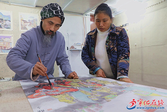 1月10日,寧化縣翠江鎮南街小巷內一幢民房內,一股濃烈的藝術氣息撲面而來,客廳的墻壁上懸掛著一幅幅精美的畫作,令人目不暇接。燈光下,畫家張秋榮正在創作工筆畫《寧陽古街》。她時而沾墨點翠,時而著色上彩,站在她旁邊的丈夫伊賢彬則不時給予指導。