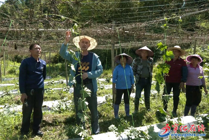 走進基地種植臺灣蘋果絲瓜的田間,工人們正在給絲瓜苗牽繩引蔓。今年蘋果絲瓜訂單早早爆滿,為讓絲瓜長勢良好,臺農呂金龍請來鄉農技站干部現場指導工人們作業,讓絲瓜上藤。