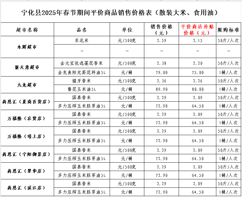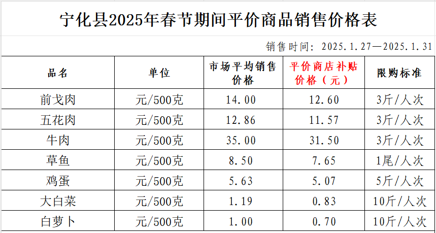 寧化縣2025年春節期間平價商品銷售價格表