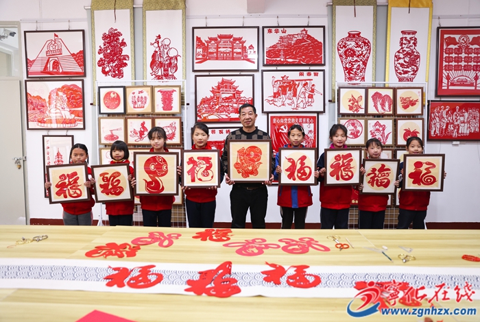 在石壁鎮客家學校剪紙工作室內,張仁鍛揮舞剪刀,紅紙翻飛,不一會兒,一個個栩栩如生的蛇形福字便躍然紙上。張仁鍛精湛的技藝吸引了許多學生自發前來學習,學生們聚精會神地觀看,被老師的技藝深深吸引。張仁鍛也耐心地指導學生們動手嘗試,從最基本的折、畫、剪開始,逐步掌握剪紙的要領。