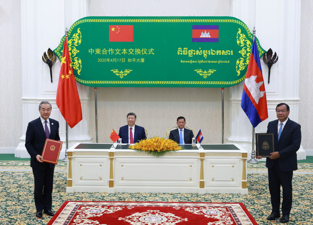 4月17日晚,國家主席習近平同柬埔寨首相洪瑪奈在金邊和平大廈舉行會談。這是會談后,兩國領導人共同見證中柬雙方交換雙邊合作文本。新華社記者 王曄 攝