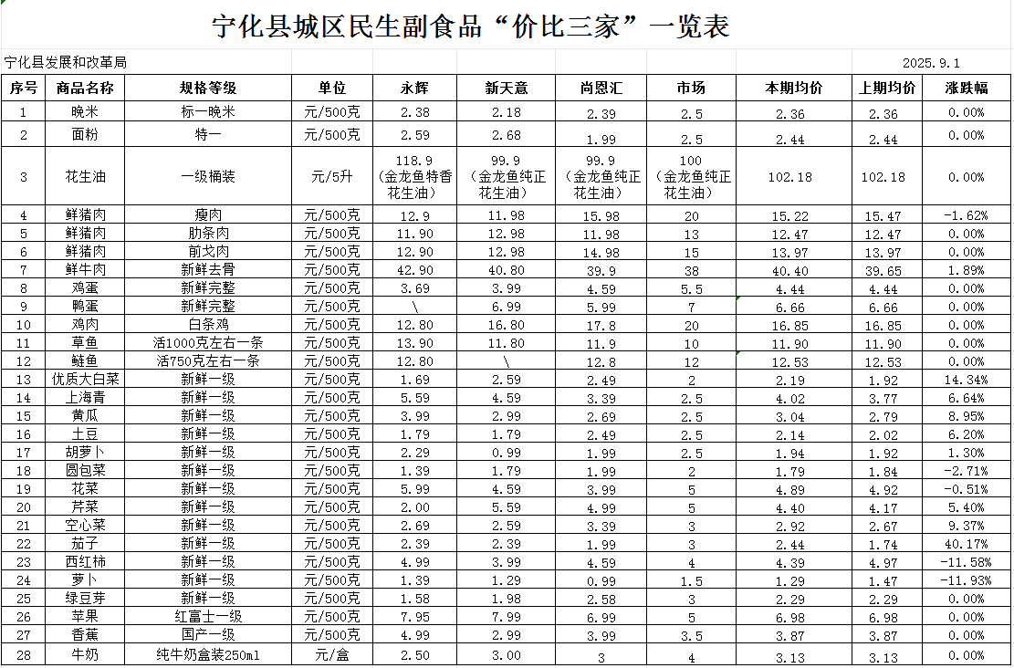 寧化縣城區(qū)民生副食品“價(jià)比三家”一覽表(9.01)