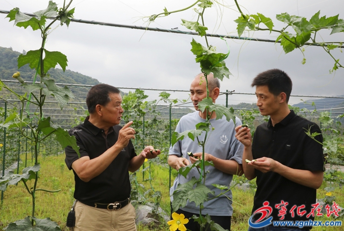 夏日,草木蔥蘢。走進寧化縣濟村鄉三村村閩臺農業融合發展推廣基地,綠油油的絲瓜藤蔓成排,一個個拳頭大小的蘋果絲瓜探出頭來,基地負責人呂金龍正和工人嫻熟地整理著絲瓜藤蔓。