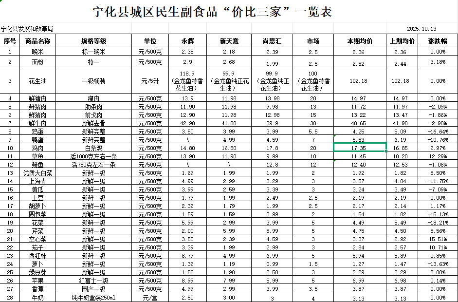 寧化縣城區民生副食品“價比三家”一覽表(10.13)