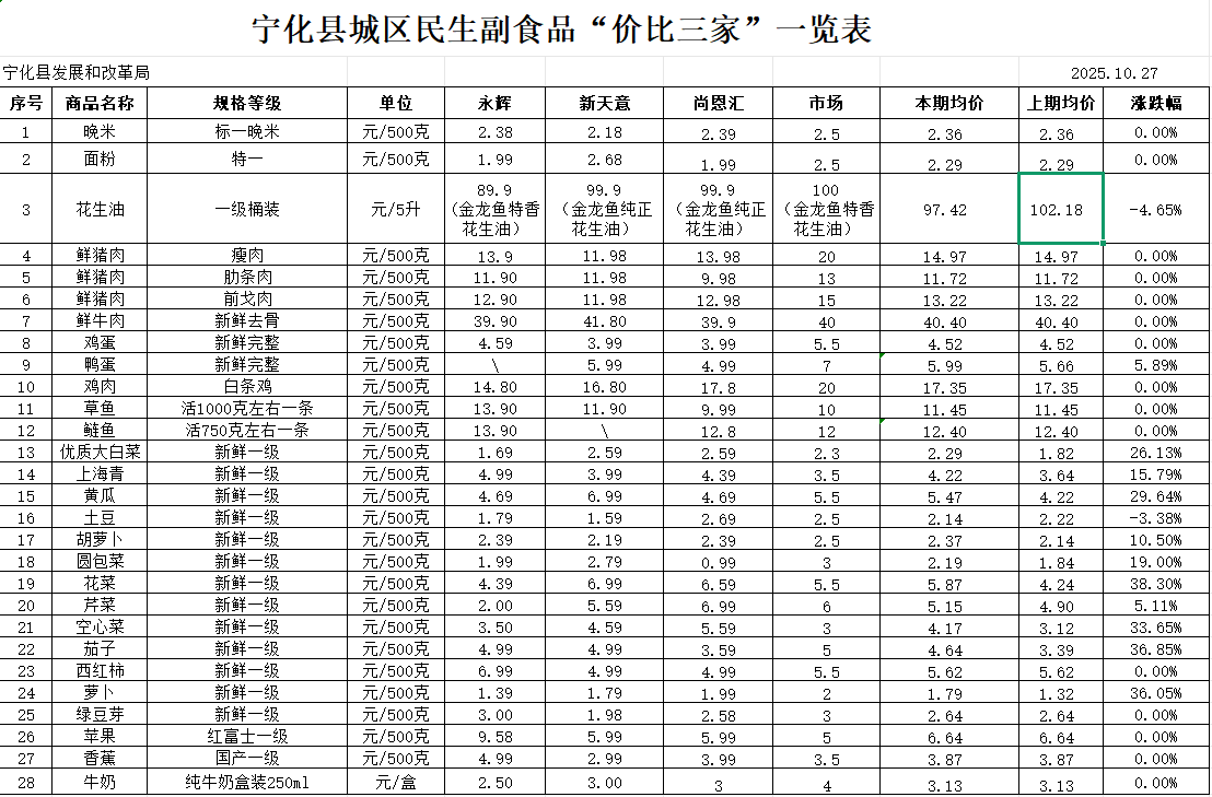 寧化縣城區(qū)民生副食品“價(jià)比三家”一覽表(10.27)