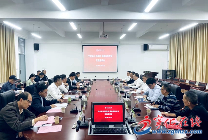 在下午召開的座談交流會上,謝錦山一行與福建農林大學副校長周順桂及林學院、農學院、食品科學學院等各院校專家就森林“四庫”建設、病蟲害防治、生態康養、林業科技服務、薏米精深加工、河龍貢米育種研發及加工等合作事項開展深度交流。