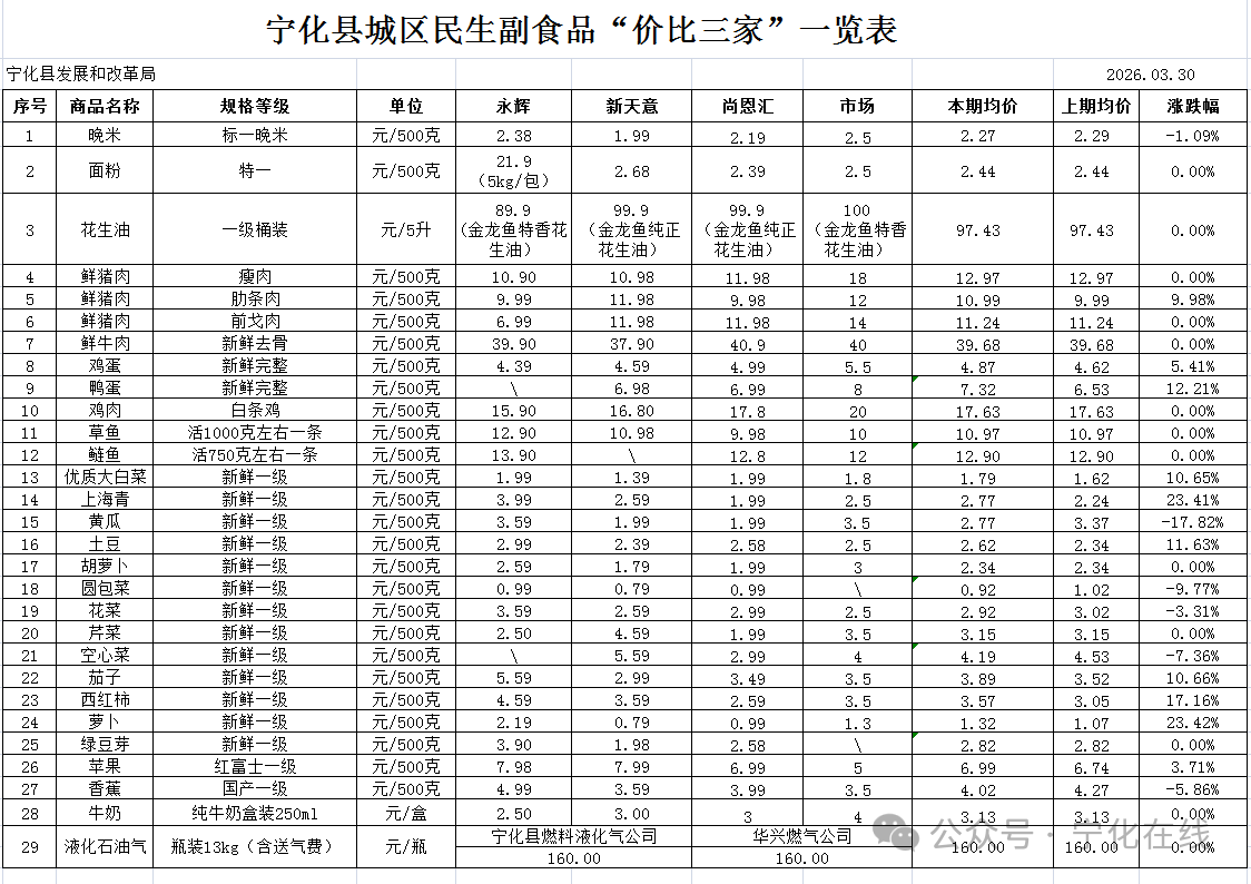 寧化縣城區(qū)民生副食品“價比三家”一覽表(3.30)