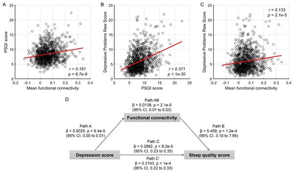 圖A、B、C展示了抑郁問題,睡眠問題以及腦功能連接三者之間的相關性,圖D展示了腦功能連接調制抑郁問題與睡眠問題的關系。 本文圖片由研究團隊提供