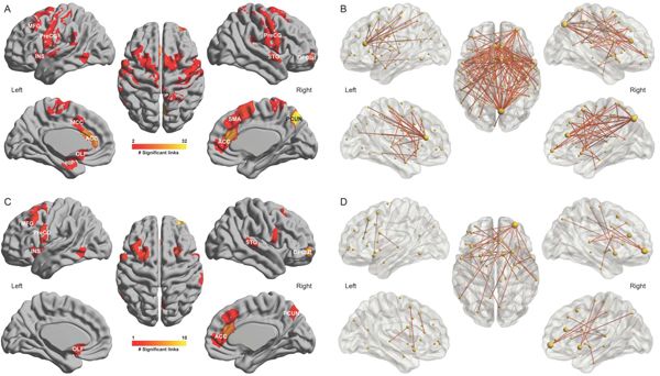 睡眠以及抑郁問題相關聯腦區(AC)以及腦功能連接(BD)在腦中的分布情況。