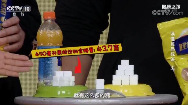 世界衛生組織推薦每日糖攝入量為50克,而這瓶450ml果粒飲料含糖量就有43.7克。