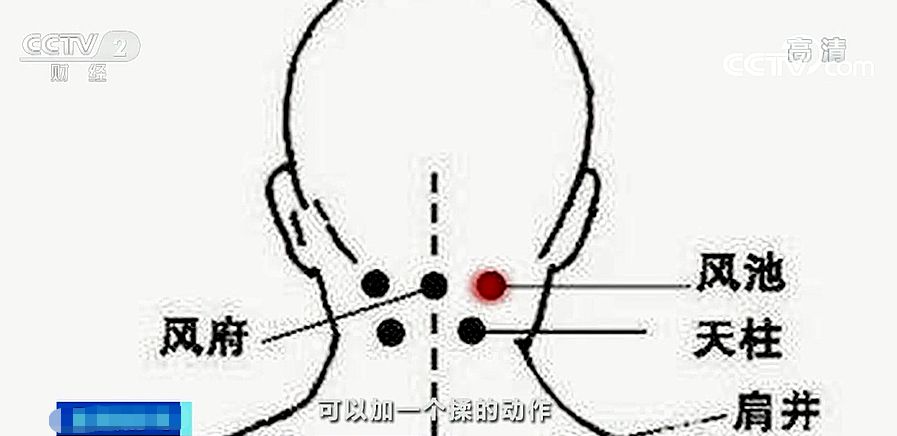北京中醫藥大學東直門醫院骨科主任醫師王建軍介紹,第一個叫風池穴,枕骨的下方有一個肌肉分叉的地方,分別叫斜方肌與胸鎖乳突肌,兩個肌肉起點的地方有個凹陷。平行耳垂進行按壓,可以加一個揉的動作,按壓的時候一定要出現酸、麻、脹、痛,這個叫得氣的感覺。