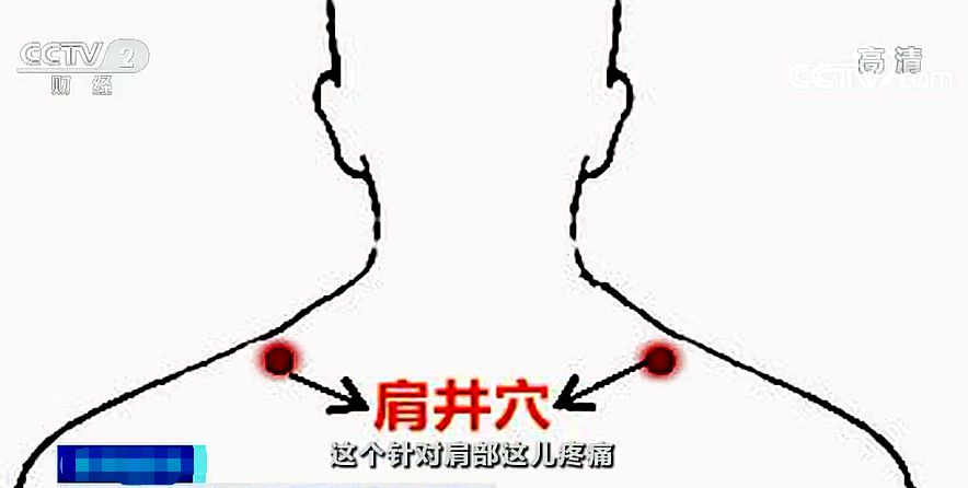 第二個叫肩井穴,首先找到大椎穴,我們摸自己最突出的骨頭,骨頭尖下方的叫大椎穴。然后再找肩峰,肩的最突出的一點叫肩峰,這兩個連線的中點叫肩井穴,這是針對肩部疼痛進行的按壓。