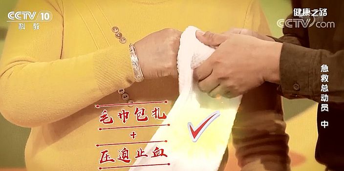 切傷后正確的處理方法是毛巾包扎,壓迫止血(視傷口大小和位置,注意力度),及時送醫。(資料來源:央視《健康之路》)