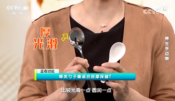 專家建議,選用邊緣比較厚且光滑的勺子比較合適。瓷勺,邊緣厚且光滑的不銹鋼勺可作為按揉工具。