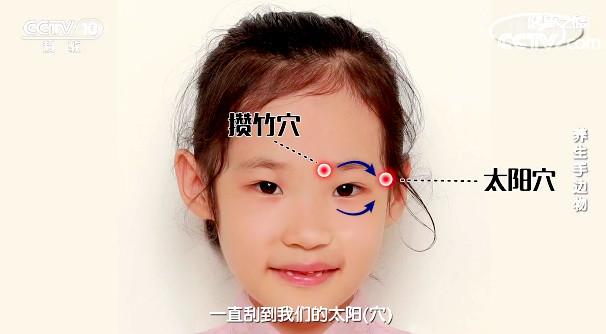 用勺尾巴從外向內旋轉點按穴位,每個穴位做兩個八拍,可以明目通絡。