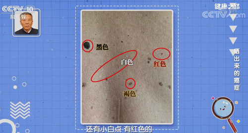 上圖是一位老年人胸前部有斑點的照片,專家表示,圖中紅色、黑色、白色、褐色的斑點是皮膚老化的一種表現,是老年人常有的現象,不會變成癌,不用擔心。