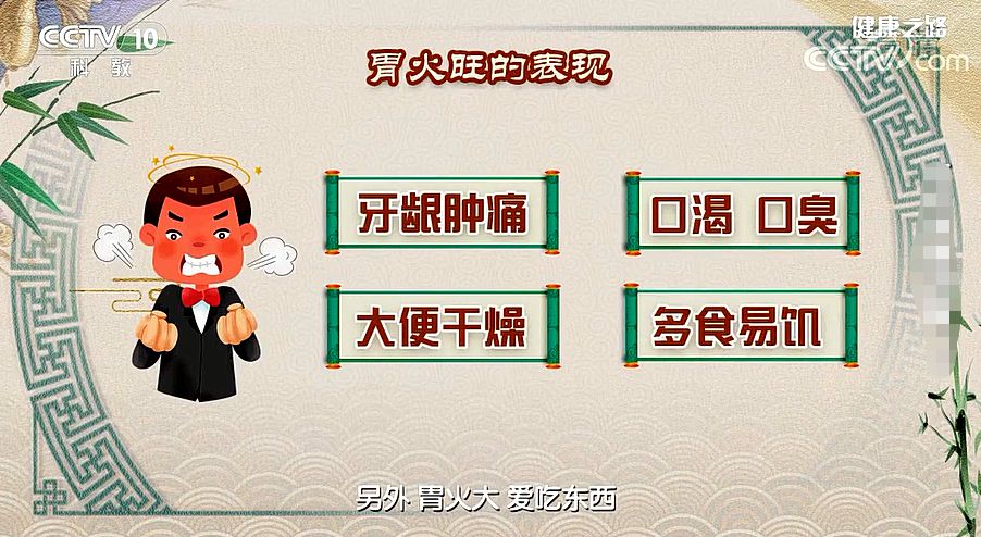 北京中醫藥大學東直門醫院呼吸科主任醫師張立山介紹,如果出現牙齦腫痛、口渴、口臭(口氣)、大便干燥、胃火大愛吃東西還容易餓,這些都可能是胃火比較旺的表現。