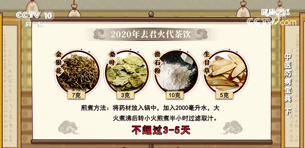 專家提醒:急性發(fā)熱剛?cè)鷷r(shí),不宜喝2020年去君火代茶飲。(資料來源:央視《健康之路》)