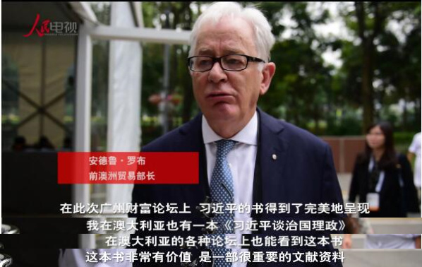 與會(huì)的澳大利亞前貿(mào)易和投資部長(zhǎng)安德魯·羅布告訴媒體他在澳大利亞就讀過(guò)這本書,“這本書介紹了習(xí)近平的重要思想和中國(guó)發(fā)展的經(jīng)驗(yàn)”。接受采訪時(shí),這位外國(guó)友人的手里正好就拿著一本英文版《習(xí)近平談治國(guó)理政》第二卷。