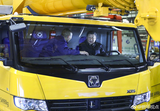 2017年12月12日下午,正在徐工集團考察的習近平,坐進剛下線的XCA220型全地面起重機駕駛室,向技術人員詳細詢問起重機的性能、產量、價格等。(圖片來源:新華社)