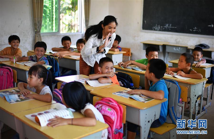 特崗鄉村英語教師黃妮娜(中)在海南省保亭黎族苗族自治縣保城鎮西坡小學上課(2017年9月4日攝)。她分管三個小學,每周要上27節課。新華社記者郭程攝