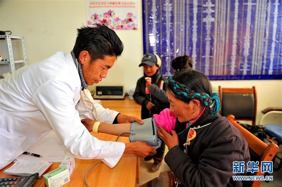 普瑪江塘鄉衛生院全科醫生旺扎為農牧民查體(2018年1月14日攝)。2014年,旺扎從西藏藏醫學院畢業,來到條件艱苦的鄉衛生院工作,承擔全鄉282戶近1100人的衛生保健任務。新華社記者張汝鋒攝