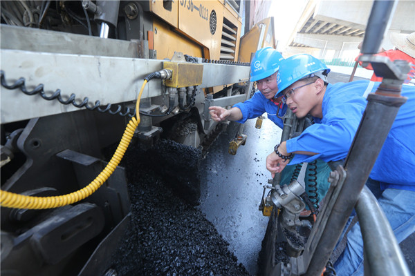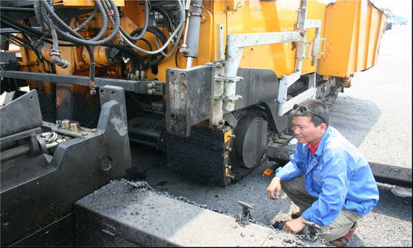 由于工作條件特殊,袁師傅所在團隊長期奮戰在施工第一線,而炎熱的夏天又是鋪攤作業的旺季,因此團隊需要忍受高溫與疲憊的侵擾。在100攝氏度的瀝青上,一站就是8個小時,工人們累了只能在路邊蹲著休息。惡劣的工作環境磨練出他們直面挑戰、敢為人先的斗志。雖然是“鋪路工”,但瀝青攤鋪的平整度精確到以毫米來計量。因為在高速路上,由于車速快,若有3毫米的差異就會明顯感到車子顛簸。攤鋪時會受到路面建設、天氣等各種因素影響,攤鋪機前進時每分鐘不能超過3-4米,要保持勻速才能保證平整度。機器進不去的地方,就得找“上等師傅”推著T形耙人工壓路,犄角旮旯都得照顧到。這個時候更是要講究“上等師傅”的手藝、經驗。雖然辛苦,但袁學強覺得很有成就感。