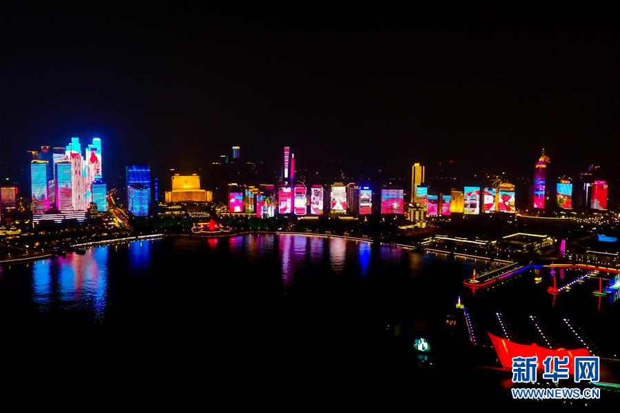 這是青島浮山灣展現青島風光的主題燈光秀(5月7日無人機拍攝)。新華社記者 李紫恒 攝