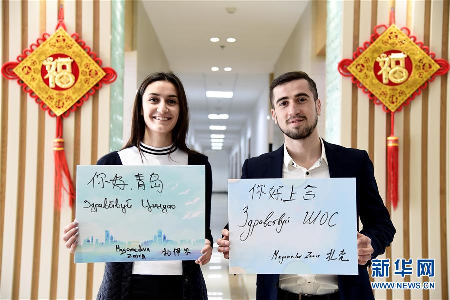 在位于青島的中國石油大學(華東)學習的俄羅斯留學生扎克(右)和扎伊爾兄妹倆用漢語和母語寫下“你好,上合”“你好,青島”(5月3日攝)。新華社記者 郭緒雷 攝