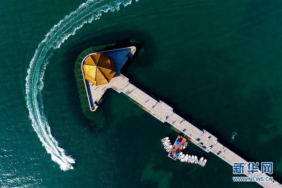 一艘游艇駛過青島棧橋旁的海面(5月4日無人機拍攝)。新華社記者 郭緒雷 攝