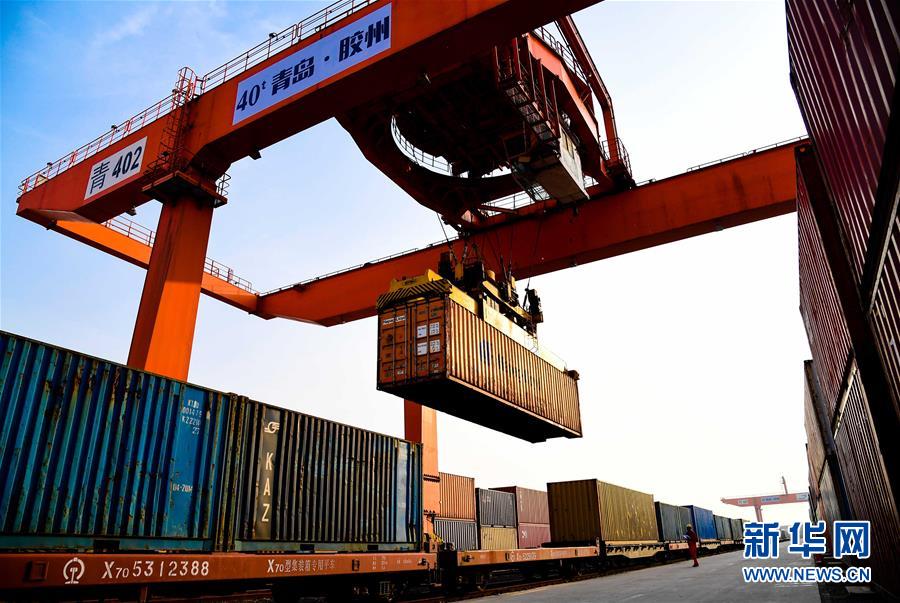 在青島膠州灣國際物流園,龍門塔吊在往中亞班列上裝載貨物(5月7日攝)。新華社記者 郭緒雷 攝