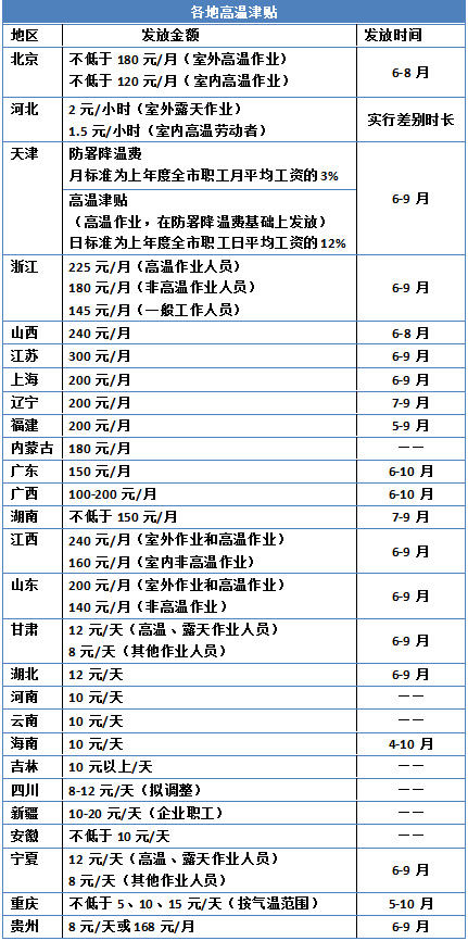 從高溫津貼發(fā)放時間來看,各地也因氣候條件差異有所區(qū)別。如,北京、山西等北方地區(qū)的發(fā)放時間段為6到8月,海南省的發(fā)放時間長達(dá)7個月,為4到10月。