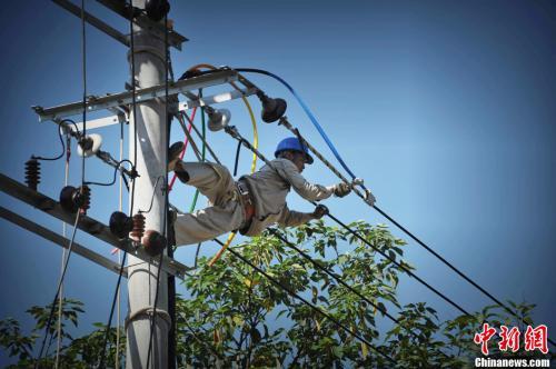 資料圖:福州一電力作業(yè)人員冒高溫爬上電桿作業(yè)。王東明 攝