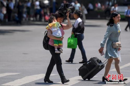 5月15日,湖南長沙持續(xù)高溫,市民頭頂烈日出行。 中新社記者 楊華峰 攝