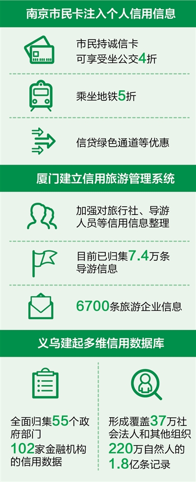 國家發(fā)展改革委、中國人民銀行今年1月聯(lián)合公布首批社會信用體系建設(shè)示范城市名單,南京、廈門、義烏等12個城市“上榜”。通過建立社會信用體系建設(shè)推進(jìn)機(jī)制和公共信用信息共享平臺、建立紅黑名單及管理辦法、創(chuàng)新信用惠民惠企措施等,城市信用體系建設(shè)不斷推進(jìn),守信者受益、失信者難行的社會氛圍正在形成。