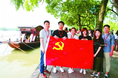 浙江嘉興南湖,黨員干部手擎黨旗與紅船合影留念。本報(bào)記者 郭俊鋒攝/光明圖片