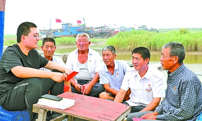 7月11日,山東濱州沾化區(qū)馮家鎮(zhèn)漁船停靠點(diǎn),馮家鎮(zhèn)海上黨支部“送學(xué)小分隊(duì)”成員崔浩(左一)在為漁民黨員講解黨章。王建彬攝/光明圖片