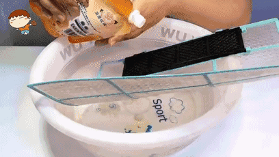 第二步:溫水打濕后,可用中性洗衣液清洗。清洗時(shí)最好不要用刷子刷過(guò)濾網(wǎng),以免把網(wǎng)眼刷大。
