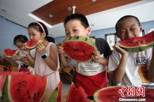 資料圖:小朋友“啃秋”,迎秋爽。 孟德龍 攝