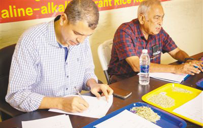 2018年5月,各國測產(chǎn)專家正對青島海水稻研發(fā)中心迪拜試驗基地的海水稻進行測產(chǎn)。資料圖片