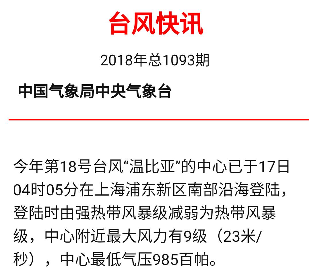 央視網消息:據中央氣象臺報告,今年第18號臺風“溫比亞”的中心已于17日04時05分在上海浦東新區南部沿海登陸,登陸時由強熱帶風暴級減弱為熱帶風暴級,中心附近最大風力有9級(23米/秒),中心最低氣壓985百帕。(央視記者 池平)