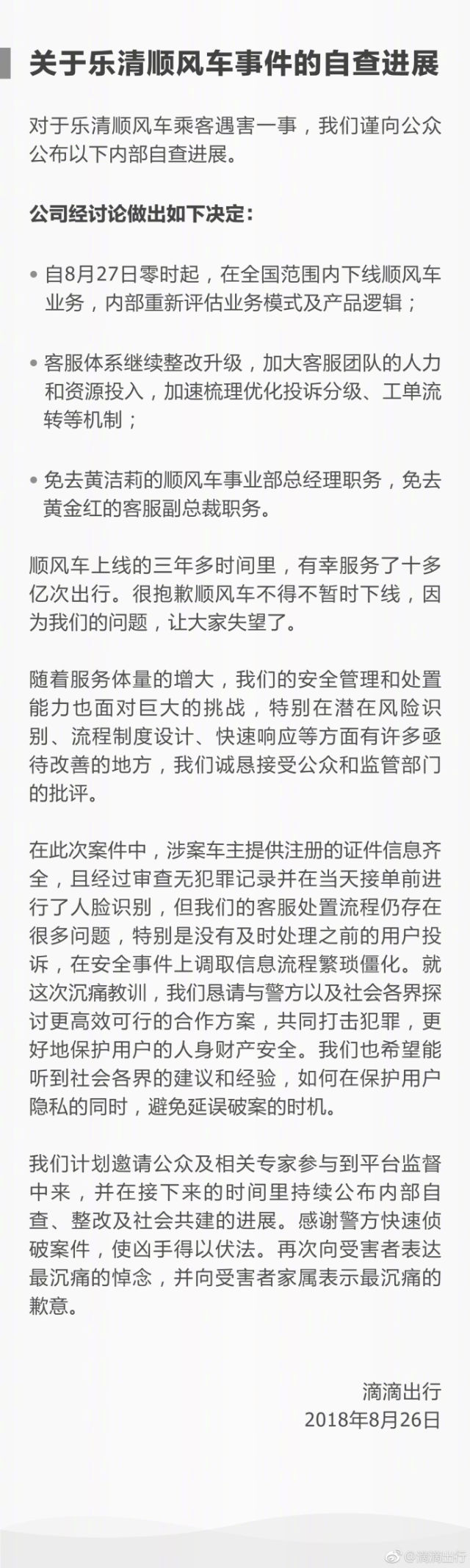 滴滴出行26日公布了樂清順風車乘客遇害事件自查進展情況,宣布自8月27日零時起,在全國范圍內下線順風車業務。同時,免去黃潔莉順風車事業部總經理職務,免去黃金紅客服副總裁職務。全文如下: